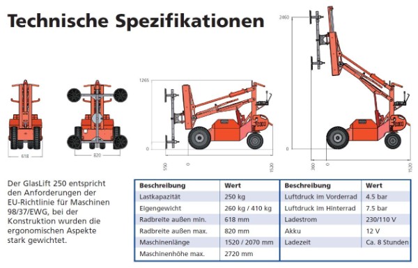Glaslift Mietpreis pro Tag, ohne Facharbeiter zzgl. Mwst. - 225,00 € Sie erhalten bei Abholung eine ausführliche Einweisung.